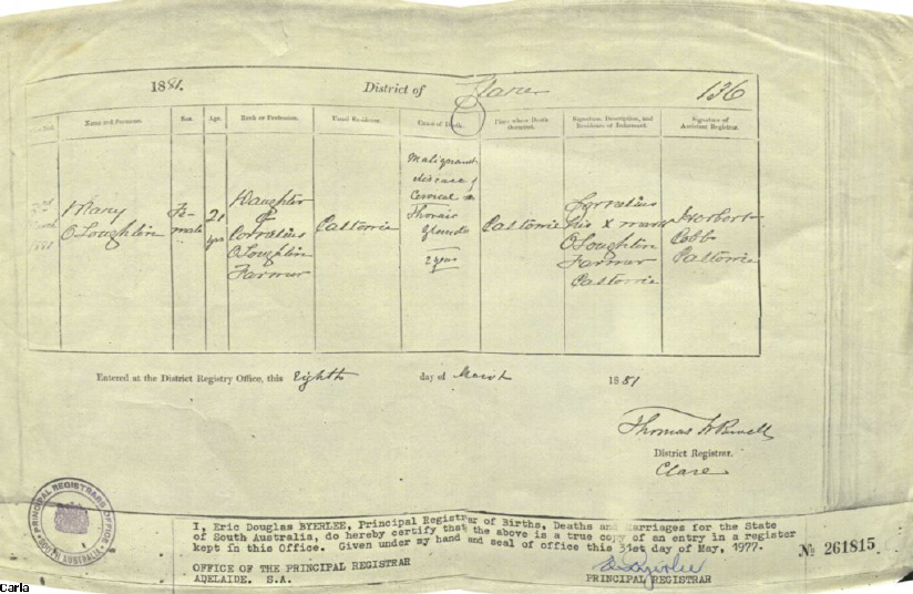 Mary was born at Virginia. She suffered ill health for some years and died on 3rd March 1881 aged 21 years. Very little is known about Mary and she is buried in the same grave as her parents at Caltowie.